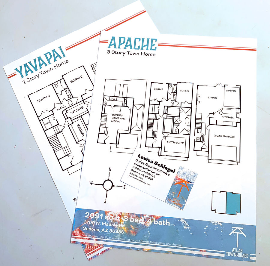 Atlas Townhomes is a retirement community in Sedona, Arizona. Atlas wanted a condo brochure that allowed retirees’ to have the creative freedom to make their own retirement. The brochure, with multiple deliverables (folder, business card, floor plans and a give-away with packaging) would reflect the what Atlas Townhomes and the town of Sedona had to offer new residents.