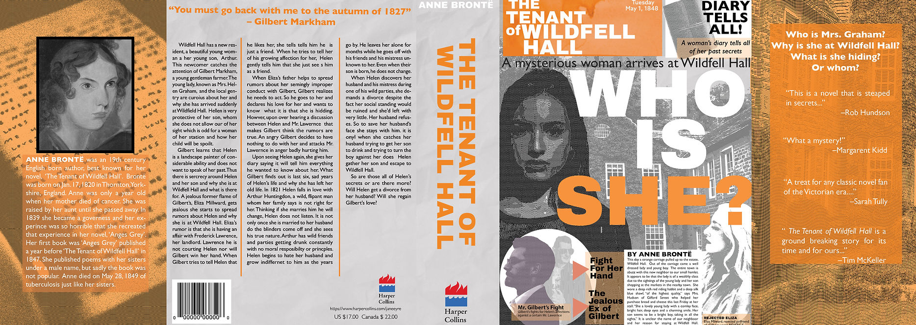 Usually British tabloids use reds, blues and yellows to color the major headlines, however yellow did not show up well. So to capture the unusualness of the character of Mrs Helen Graham who comes to Wildfell Hall so suddenly, I chose the color orange.