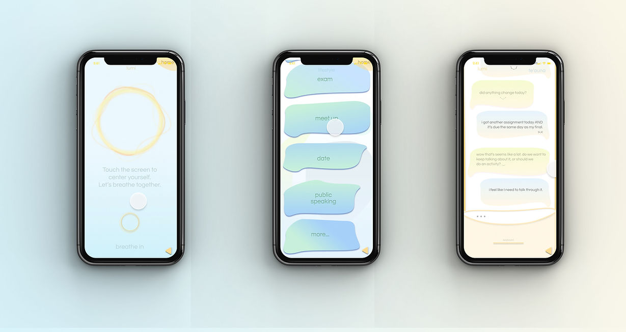 The Lumi AI takes the user through breathing exercises that can calm the user's anxiety and clear the mind. The app can also talk the user through their anxiety by allowing the user to talk to the app and unburden themselves.